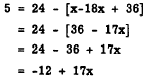 REMOVING SIGNS OF GROUPING If signs of grouping appear in an equation they should be removed in the manner indicated in chapter 9 of this course. For example, solve the equation.5 = 24 - [x-12(x-2) - 6(x-2)] Notice that the same expression, x-2, occurs in both parentheses. By combining the terms containing (x-2), the equation becomes5 = 24 - [x-18(x-2)] Next, remove the parentheses and then the bracket, obtaining