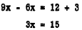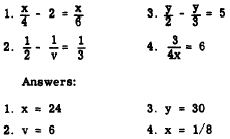 Divide both members by -17. The solution is x=1 EQUATIONS CONTAINING FRACTIONS To solve for x in an equation such as first clear the equation of fraction, To do this, find the least common denominator of the fraction. Then multiply both rider of the equation by the LCD. The least common denominator of 3, 12, 4, and 2 is 12. Multiply both rider of the equation by 12. The resulting equation is 8x + x - 12 - 3 + 8x Subtract 6x from both members, add 12 to both members, and collect like terms as follows: