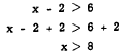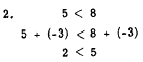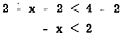 The addition of -3 to both members does not change the sense of the inequation. Addition of the same quantity to both members is a useful method for solving inequations. In the following example, 2 is added to both members in order to isolate the x term on the left: