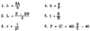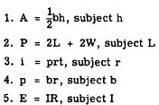 SUBJECT OF A FORMULA Usually a formula is taken almost directly from the verbal rule or law. For instance, the perimeter of a rectangle is equal to twice the length plus twice the width. Where possible, letters are used as symbols for the words. Thus, P = 2L + 2W. A simple formula such as this is like a declarative sentence. The left half is the SUBJECT and all the rest is the predicate. The subject is P. It corresponds to the part of the verbal rule that reads "the perimeter of a rectangle." This subject is usually a single letter followed by the equality sign.All formulas are equations, but not all equations are formulas. Some distinctions between a formula and an ordinary equation are worthy of note. The equation may not have a subject, while the formula typically does. In the formula, the unknown quantity stands alone in the left-hand member. No computation is performed upon it, and it does not appear more than once. In the equation, on the other hand, the unknown quantity may appear once or more in either or both members, and computation may be performed with it or on it. We evaluate a formula by substituting for the literal numbers in the right member. An equation is solved by computation in either or both members until all that remains is an unknown in one member and a known quantity in the other. The solution of an equation usually requires a knowledge of algebraic principles, while the evaluation of a formula may ordinarily be accomplished with only a knowledge of arithmetic.SYMBOLS Letters that represent words have been standardized in many cases so that certain formulas may be written the same in various texts and reference books. However, to avoid any misunderstanding a short explanation often accompanies formulas as follows:A = hw,where A = area in square units Subscripts and Primes In a formula in which two or more of the same kind of letters are being compared, it is desirable to make a distinction between them. In electronics, for example, a distinction between resistances may be indicated by Ra and Rb or R1 and R2. These small numbers or letters written to the right and below the Rs are called subscripts. Those shown here are read: R sub a, R sub b, R sub one, and R sub two. Primes are also used in the same manner to distinguish between quantities of the same kind. Primes are written to the right and above the letters, as in S, S", and S". They are read: S prime, S double prime, and S triple prime.CHANGING THE SUBJECT OF A FORMULAIf values are given for all but one of its variables, a formula can be solved to obtain the value of that variable. The first step is usually the rearranging of the formula so that the unknown value is the subject-that is, a new formula is derived from the original. For example, the formula for linear motion-distance equals rate times time-is usually writtend =rt Suppose that instead of the distance we wish to know the rate, r, or the time, t. We simply change the subject of the formula by the algebraic means developed in earlier chapters. Thus, in solving the formula for r, we divide both sides by t, with the following result: