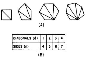 Figure 14-3.-Diagonals of plane figures. The table in figure 14-3 (B) compares the number of sides of each polygon with the number of diagonals that can be drawn from any one vertex. Using this table, we make a formula for the number, d, of diagonals that can be drawn from one vertex of a polygon of n sides. In the table we note that the number of diagonals is always 3 less than the number of sides. Therefore the formula is d = n - 3.Practice problems. Complete the following tables and write formulas to show the relationship between the numbers.
