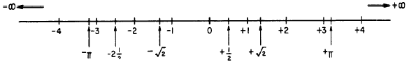 Figure 15-1. -The real number system. IMAGINARY NUMBERS The number line pictured in figure 15-1 represents all positive and negative numbers from plus infinity to minus infinity. However, there is a type of number which does not fit into the picture. Such a number occurs when we try to solve the following equation: