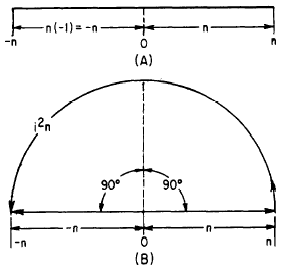 following four quantities: GRAPHICAL REPRESENTATION Figure 15-1 shows the real numbers represented along a straight line, the positive numbers extending from zero to the right for an infinite distance, and the negative numbers extending to the left of zero for an infinite distance. Every point on this line corresponds to a real number, and there are no gaps between them. It follows that there is no possibility of representing imaginary numbers on this line. Earlier, we noted that certain signs could be used as operators. The plus sign could stand for the operation of addition. The minus sign could stand for the operation of subtraction. Likewise, it is easy to explain the imaginary number i graphically as an operator indicating a certain operation is to be performed on the number of which it is the coefficient. If we graphically represent the length, n, on the number line pictured in figure 15-2 (A), we start at the point 0 and measure to the right (positive direction) a distance representing n units. If we multiply n by -1, we may represent the result -n by measuring from 0 in a negative direction a distance equal to n units. Graphically, multiplying a real number by -1 is equivalent to rotating the line that represents the number about the point 0 through 180 so that the new position of n is in the opposite direction and a distance n units from 0. In this case we may think of -1 as the operator that rotates n through two right angles to its new position (fig. 15-2 (B)). As we have shown, i2 = -1. Therefore, we have really multiplied n by i2, or i x i. In other words, multiplying by -1 is the same as multiplying by i twice in succession. Logically, if we multiplied n by i just once, the line n would be rotated only half as much as before-that is, through only one right angle, or 90. The new segment ni would be measured in a direction 90" from the line n. Thus, i is an operator that rotates a number through one right angle. (See fig. 15-3.) We have shown previously that a positive number