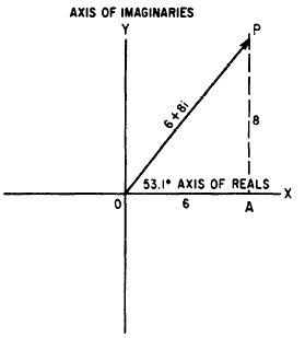 Figure 15-9. -A complex number shown as a vector.the legs of the triangle, which in this case are the real numbers, 6 and 8. thus,