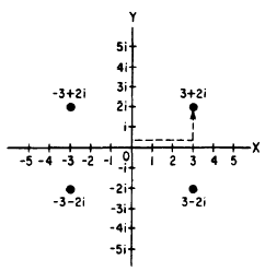 Figure 15-8.-Plotting complex numbers. positive direction. At point (3, 0) on the real axis we turn through one right angle and measure 2 units up and parallel to the imaginary axis. Likewise, the number -3 + 2i is 3 units to the left and up 2 units; the number 3 - 2i is 3 units to the right and down 2 units; and the number -3 -2i is 3 units to the left and down 2 units. Complex Numbers as Vectors A vector is a directed line segment. A complex number represents a vector expressed in the RECTANGULAR FORM. For example, the complex number 6 + 8i in figure 15-9 may be considered as representing either the point P or the line OP. The real parts of the complex number (6 and 8) are the rectangular components of the vector. The real parts are the legs of the right triangle (sides adjacent to the right angle), and the vector OP is its hypotenuse (side opposite the right angle). If we merely wish to indicate the vector OP, we may do so by writing the complex number that represents it along the segment as in figure 15-9. This method not only fixes the position of point P, but also shows what part of the vector is imaginary (PA) and what part is real (OA).If we wish to indicate a number that shows the actual length of the vector OP, it is necessary to solve the right triangle OAP for its hypotenuse. This may be accomplished by taking the square root of the sum of the squares of