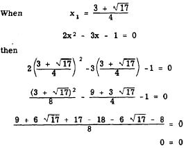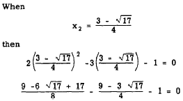 In decimal form, the roots of 2x2 - 3x -1 = 0 to the nearest tenth are 1.8 and -0.3. Notice that the subscripts, 1 and 2, are used to distinguish between the two roots of the equation. The three roots of a cubic equation in x might be designated x1, x2, and x1. Sometimes the letter r is used for root. Using r, the roots of a cubic equation could be labeled r1, r2, and r3.Checking:
