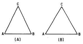 Figure 17-11.-(A) Isosceles triangle; (B) equilateral triangle. Figure 17-11 (B) illustrates an EQUILATERAL triangle, which is a special case of an isosceles triangle. An equilateral triangle has all three of its sides equal in length. Since the lengths of the sides are directly related to the size of the angles opposite them, an equilateral triangle is also equiangular; that is, all three of its angles are equal. OBLIQUE TRIANGLES. -Any triangle containing no right angle is an OBLIQUE triangle. Figure 17-12 illustrates two possible configurations, both of which .are oblique triangles. An oblique triangle which contains an obtuse angle is often called an OBTUSE triangle.