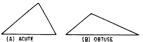 Figure 17-12.--Oblique triangles. (A) Acute; (B) obtuse. Sum of the Angles The sum of the angles in any triangle is 180. For example, if one of the angles is 40 and another is 20, the third angle is 120. It is this relationship that justifies the statements made in the preceding section concerning 45 triangles and 30-60-90 triangles. If two of the angles are 45 each, then the third angle is 180 - (45+45) and the figure is a right tri- angle. If one angle is 60 and another is 30, the third angle is 90 and the figure is a right triangle. |