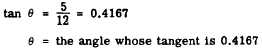 Assuming that the sides and angles in figure 19-9 are in approximately the correct proportions, we estimate that angle q is about 20. The table entries for the tangent in the vicinity of 20 are slightly too small, since we need a number near 0.4167. However, the tangent of 22 36 is 0.4163 and the tangent of 22 42 is 0.4183. Therefore, q is. between 22 36 and 22 42 . |