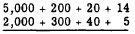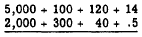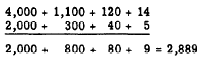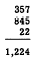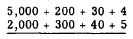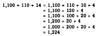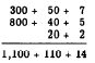 The answer was found by a process called "carrying." In this process extra digits, generated when a column sum exceeds 9, are carried to the next column to the left and treated as addends in that column. Carrying may be explained by grouping the original addends. For example, 357 actually means 3 hundreds plus 5 tens plus 7 units. Rewriting the problem with each addend grouped in terms of units, tens, etc., we would have the following: