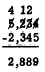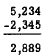A 10 has been borrowed from the tens column and combined with the 3 in the units column to make a number large enough for subtraction of the 8. Notice that borrowing to increase the value of the digit in the units column reduces the value of the digit in the tens column by 1. Sometimes it is necessary to borrow in more than one column. For example, suppose that we wish to subtract 2,345 from 5,234. Grouping the minuend and subtrahend in units, tens, hundreds, etc., we have the following: