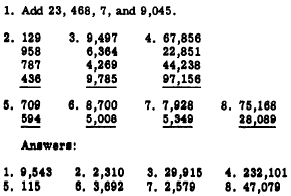 It is customary to draw a line below the last addend, placing the answer below this line. Subtraction problems are arranged in columns in the same manner as for addition, with a line at the bottom and the answer below this line.Carry and Borrow Problems involving several addends, with two or more digits each, usually produce sums in one or more of the columns which are greater than 9. For example, suppose that we perform the following addition: