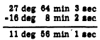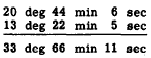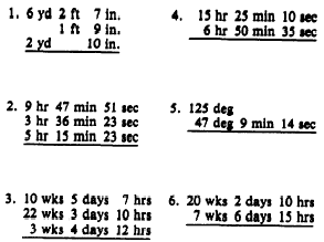 This answer is regrouped as 34 deg 6 min 11 sec. Numbers must be expressed fn units of the same kind, in order to be combined. For instance, (he sum of 6 kilowatts plus 1 watt is not 7 kilowatts nor is it 7 watts. The sum can only be indicated (rather than performing the operation) unless some method is used to write these numbers in units of the same value. Subtraction of denominate numbers also involves the regrouping idea. If we wish to subtract 16 deg 8 min 2 set from 28 deg 4 min 3 set, for example, we would have the following arrangement: