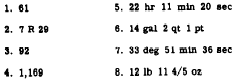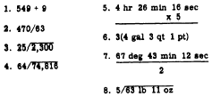 Simplifying, this is 17 yd 1 ft 6 in. When one denominate number is multiplied by another, a question arises concerning the products of the units of measurement. The product of one unit times another of the same kind is one square unit. For example, 1 ft times 1 ft is 1 square foot, abbreviated sq ft; 2 in. times 3 in. is 6 sq in.; etc. If it becomes necessary to multiply such numbers as 2 yd 1 ft times 6 yd 2 ft, the foot units may be converted to fractions of a yard, as follows: (2 yd 1 ft)(6 yd 2 ft) = (2 l/3 yd)(6 2/3 yd) In order to complete the multiplication, a knowledge of fractions is needed. Fractions are discussed in chapter 4 of this training course. Division The division of denominate numbers requires division of the highest units first; and if there is a remainder, conversion to the next lower unit, and repeated division until all units have been divided. In the example (24 gal 1 qt 1 pt) + 5, we perform the following steps: Step 1:
