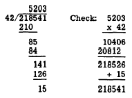 example where the quotient was 12 Suppose that $13 is available for the purchase of spare parts, and the parts needed cost $3 each. Four parts can be bought with the available money, and $1 will be left over. Since it is not possible to buy l/3 of a part, expressing the result as 4 R 1 gives a more meaningful answer than 4 l/3. Placement of Decimal Points In division, as in multiplication, the placement of the decimal point is important. Determining the location of the decimal point and the number of places in the quotient can be relatively simple if the work is kept in the proper columns. For example, notice the vertical alignment in the following problem: We notice that the first two places in the dividend are used to obtain the first place in the quotient. Since 3 is in the hundreds column there are two more places in the quotient (tens place and units place). The decimal point in the quotient is understood to be directly above the position of the decimal point in the dividend. In the example shown here, the decimal point is not shown but is understood to be immediately after the second 1. Checking Accuracy The accuracy of a division of numbers can be checked by multiplying the quotient by the divisor and adding the remainder, if any. The result should equal the dividend. Consider the following example: