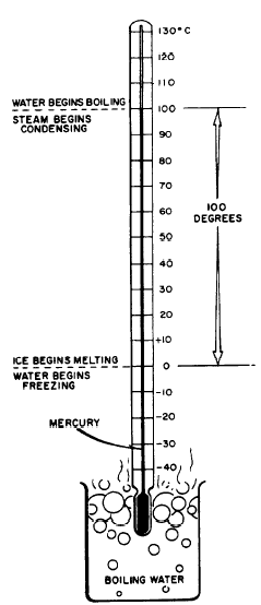 Figure 3-l.-Celsius (centigrade) temperature scale. a measurement of 3 units below the starting point.The two lines of the rectangular coordinate system which pass through the 0 position are the vertical axis and horizontal axis. Other vertical and horizontal lines may be included, forming a grid. When such a grid is used for the location of points and lines, the resulting "picture" containing points and lines is called a GRAPH.