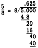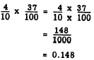 Answers: 1. 0.074 Multiplying by Powers of 10 Multiplying by a power of 10 (10, 100, 1,000, etc.) is done mechanically by simply moving the decimal point to the right as many places as there are zeros in the multiplier. For example, 0.00687 is multiplied by 1,000 by moving the decimal point three places to the right as follows:1,000 x 0.00687 = 6.87 Multiplying a number by 0.1, 0.01, 0.001, etc., is done mechanically by simply moving the decimal point to the left as many places as there are decimal places in the multiplier. For example, 348.2 is multiplied by 0.001 by moving the decimal point three places to the left as follows:348.2 x 0.001 = 0.3482 DIVISION When the dividend is a whole number, we recognize the problem of division as that of converting a common fraction to a decimal. Thus in the example 5 + 8, we recall that the problem could be written