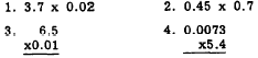 We note that 4 and a fraction times 3 and a fraction yields a product in the neighborhood of 12. Thus, the decimal point is in the logical place.In the above examples it should be noted in each case that when we multiply the decimals together we are multiplying the numerators. When we place the decimal point by adding the number of decimal places in the multiplier and multiplicand, we are in effect multiplying the denominators.When the numbers multiplied together are thought of as the numerators, the decimal points may be temporarily disregarded and the numbers may be considered whole. This justifies the apparent disregard for place value in the multiplication of decimals. We see that the rule for multiplying decimals is only a modification of the rule for multiplying fractions. To multiply numbers in which one or more of the factors contain a decimal, multiply as though the numbers were whole numbers. Mark off as many decimal places in the product as there are decimal places in the factors together.348.2 x 0.001 = 0.3482 Practice problems. Multiply as indicated: