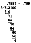 Since not all decimals generated by division terminate so early as that in the above example, if at all, it should be predetermined as to how many decimal places it is desired to carry the quotient. If it is decided to terminate a quotient at the third decimal place, the division should be carried to the fourth place so that the correct rounding off to the third place may be determined.When the dividend contains a decimal, the same procedure applies as when the dividend is whole. Notice the following examples (rounded to three decimal places):1. 6.31 8 2. 0.0288 32 Observe in each case (including the case where the dividend is whole), that the quotient contains the same number of decimal places as the number used in the dividend. Notice also that the place values are rigid; that is, tenths in the quotient appear over tenths in the dividend, hundredths over hundredths, etc. Practice problems. In the following division problems, round off each quotient correct to three decimal places.1. 10 6 3. 2.743 77 4. 1.00 3 Answers: 1. 1.667 3. 0.036 4. 0.333 |
