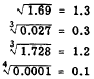 When a decimal is raised to a power, the number of decimal places in the result is equal to the number of places in the decimal multiplied by the exponent. For example, consider (0.12). There are two decimal places in 0.12 and 3 is the exponent. Therefore, the number of places in the power will be 3(2) = 6. The result is as follows:(0.12)3 = 0.001728 The truth of this rule is evident when we recall the rule for multiplying decimals. Part of the rule states: Mark off as many decimal places in the product as there are decimal places in the factors together. If we carry out the multiplication, (0.12) x (0.12) x (0.12), it is obvious that there are six decimal places in the three factors together. The rule can be shown for any decimal raised to any power by simply carrying out the multiplication indicated by the exponent.Consider these examples: (1.4)2 = 1.96 Finding a root of a number is the inverse of raising a number to a power. To determine the number of decimal places in the root of a perfect power, we divide the number of decimal places in the radicand by the index of the root. Notice that this is just the opposite of what was done in raising a number to a power.Consider