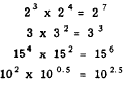 The law of exponents for multiplication may be stated as follows: To multiply two or more powers having the same base, add the exponents and raise the common base to the sum of the exponents. This law is further illustrated by the following examples: