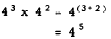 LAWS OF EXPONENTS All of the laws of exponents may be developed directly from the definition of exponents. Separate laws are stated for the following five cases:1. Multiplication. MULTIPLICATION To illustrate the law of multiplication, we examine the following problem:43 x 42 = ? Recalling that 43 means 4 x 4 x 4 and 42 means 4 x 4, we see that 4 is used as a factor five times. Therefore 43 x 42 is the same as 45. This result could be written as follows:43 x 42 = 4 x 4 x 4 x 4 x 4 Notice that three of the five 4s came from the expression 43, and the other two 4s came from the expression 42. Thus we may rewrite the problem as follows: