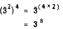 Therefore the law of exponents for division is as follows: To divide one power into another having the same base, subtract the exponent of the divisor from the exponent of the dividend.Use the number resulting from this subtraction as the exponent of the base in the quotient. Use of this rule sometimes produces a negative exponent or an exponent whose value is 0. These two special types of exponents are discussed later in this chapter.POWER OF A POWER Consider the example (32)4. Remembering that an exponent shows the number of times the base is to be taken as a factor and noting in this case that 32 is considered the base, we have(32)4 = 32 x 32 x 32 x 32 Also in multiplication we add exponents. Thus, 32 x 32 x 32 x 32= 3(2+2+2 +2) = 38 Therefore,