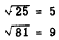 Referring to table 7-1 (A), we see that the series of numbers1, 4, 9, 16, 25, 36, 49, 64, 81, 100 comprises all the perfect squares from 1 to 100 inclusive. If any one of these numbers appears under a square root symbol, the radical sign can be removed immediately. This is illustrated as follows: