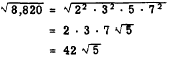 Removing a factor that occurs a number of times equal to the index of the root is equivalent to separating a radical into two radicals so that one radicand is a perfect power. The radical sign can be removed from the number that is a perfect square, cube, fourth power, etc. The root taken becomes the coefficient of the remaining radical.In order to simplify radicals easily, it is convenient to know the squares of whole numbers up to about 25 and a few of the smaller powers of the numbers 2, 3, 4, 5, and 6. Table 7-1 shows some frequently used powers of numbers.Table 7-1.-Powers of numbers.