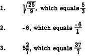 The number 180, resulting from the multiplication of 9 by 20,is written as a trial divisor beside the new dividend (925), as shown. The quotient digit (5) is then recorded and the trial divisor is adjusted, becoming 185. The trial quotient (180) is crossed out.4. The true divisor (185) is multiplied by the second digit (5) and the product is placed below the new dividend (925). This step is shown in the illustration for step 3. When the product in step 4 is subtracted from the new dividend, the difference is 0; thus, in this example, the root is exact.5. In some problems, the difference is not 0 after all of the digits of the original number have been used to form new dividends. Such problems may be carried further by adding 0s on the right-hand end of the original number, just as in normal long division. However, in the square root process the 0s must be added and used in groups of 2. Practice problems. Find the square root of each of the following numbers: 1. 9.61 Answers: 1. 3.1 |