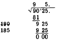 Bring down the next group (25) and place it beside the 9, as shown. This is the new dividend (925).3. Multiply the first digit in the root (9) by 20, obtaining 180 as a trial divisor. This trial divisor is contained in the new dividend (925) five times; thus the second digit of the root appears to be 5. However, this number must be added to the trial divisor to obtain a "true divisor." If the true divisor is then too large to use with the second quotient digit, this digit must be reduced by 1. The procedure for step 3 is illustrated as follows: