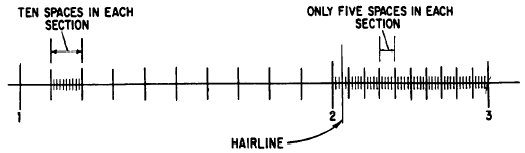 Figure 8-6.-Reading in the second division of a slide rule. 1. Locate one of the factors to be multiplied on the D scale, disregarding the decimal point.2. Place the index of the C scale opposite that number. 3. Locate the other factor on the C scale and move the hairline of the indicator to cover this factor. 4. The .product is on the D scale under the hairline. Sometimes in multiplying numbers, such as 25 x 6, the number on the C scale extends to the right of the stock and the product cannot be read. In such a case, we simply shift indices. Instead of the left-hand index of the C scale, the right-hand index is placed opposite the factor on the D scale. The rest of the problem remains the same. By shifting indices, we are simply multiplying or dividing by 10, but this plays no part in reading the significant digits. Shifting indices affects the characteristic only.EXAMPLE: 252 x 3 = 756 1. Place the left index of the C scale over 252.2. Locate 3 on the C scale and set the hair- line of the indicator over it. 3. Under the hairline on the D scale read the product, 756. EXAMPLE: 4 x 64 = 256 1. Place the right index of the C scale over 4.2. Locate 64 on the C scale and set the hairline of the indicator over it. 3. Under the hairline on the D scale read the product, 256. Practice problems. Determine the following products by slide rule to three significant digits :1. 2.8 x 16 Answers: 1. 44.8 Division Division being the inverse of multiplication, the process of multiplication is reversed to perform division on a slide rule. We subtract the length representing the logarithm of the divisor from the length representing the logarithm of the dividend to get the logarithm of the quotient.The procedure is as follows: 1. Locate the dividend on the D scale and place the hairline of the indicator over it.2. Move the slide until the divisor (on the C scale) lies under the hairline.3. Read the quotient on the D scale opposite the C scale index.If the divisor is greater numerically than the dividend, the slide will extend to the left. If the divisor is less, the slide will extend to the right. In either case, the quotient is the number on the D scale that lies opposite the C scale index, falling within the limits of the D scale.EXAMPLE : 6 3 = 2 1. Locate 6 on the D scale and place the hairline of the indicator over it.2. Move the slide until 3 on the C scale is under the hairline.3. Opposite the left C scale index, read the quotient, 2, on the D scale.EXAMPLE : 378 63 = 6 1. Locate 378 on the D scale and move the hairline of the indicator over it.2. Move the slide to the left until 63 on the C scale is under the hairline.3. Opposite the right-hand index of the C scale, read the quotient, 6, on the D scale.Practice problems. Determine the following quotients by slide rule.1. 126 3 2. 960 15 Answers: 1. 42 |