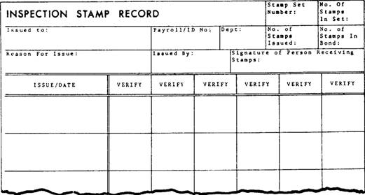 INSPECTION INDICATION STAMPS Inspection indication stamps are used to indicate QA authentication of the material condition status as either being accepted or rejected. In addition, these stamps identify the activity and the individual using the stamp. The activity and user identification is provided by the use of an alphanumerical designation system incorporated into the stamp. A letter code designates the activity, followed by a number that identifies the person to whom the stamp is assigned. The size of the letters and digits are small enough to allow space for at least three additional digits after the activity and user codes. Examples of the inspection stamps and a brief explanation of each are in figure 2-2 The QA supervisor issues the inspection stamps only to qualified personnel. Each inspector receives a set of stamps, with each stamp in the set having the same number. A stamp assignment record is maintained by the QA supervisor to ensure accountability. This assignment record consists of having the person to whom the stamps are assigned apply each stamp issued to one of the blocks on the stamp record form; that person will then initial and date each stamped block. Surveys, following the same procedures used for assignment, should be conducted every 6 months. The survey will be for all stamps assigned. A sample stamp assignment record is shown i i ure 2-2 A current record of all stamps procured by number, indicating the number of stamps in each set, the type of stamps in the set, the status of the stamps (issued, unissued, damaged, lost, etc.), and the date of verification of the status will be maintained. When a stamp is lost, the entire set of stamps is destroyed. All stamps turned in by QA personnel for any reason are held in bond, in a locked container, at least 6 months before reissue. The stamp assignment record will indicate which of the stamps are being held in bond. Stamps held in bond are verified against the new listing every 6 months. REJECT MATERIAL When QA personnel discover nonconforming material, they are to immediately identify the material as nonconforming by filling in and attaching a SUSPENDED material condition tag or label. The material is to be separated and controlled to prevent unserviceable material from being mixed with serviceable material. Normally, the material is placed in an impound area, which has boundaries physically identified by walls, rails, ropes, chains, or conspicuous markings. QA personnel must authorize the removal of material from designated impound areas.