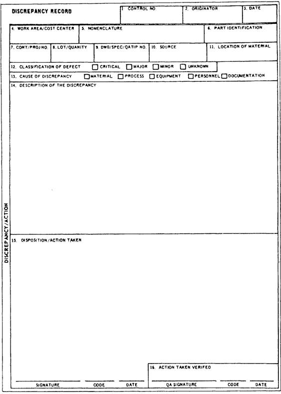 Figure 2-3.-Discrepancy record. 4. Foot protection: Foot protection must be worn when personnel are engaged in activities that involve danger from heavy falling objects. This can involve almost any job in a mine shop. 5. Electrical protection: Appropriate rubber protective equipment must be provided for personnel working on energized circuits. 6. Hearing protection: Hearing protective devices must be worn by all personnel when they enter or work in an area where the operations generate noise levels greater than 84-dB(A) sound levels or 140-dB peak-sound pressure levels or greater. The determination of which hearing protective device or combination of devices, suitable for use in each situation, is the responsibility of the industrial hygienist (or other competent personnel under the direction of an industrial hygienist). All personal protective equipment must be of a safe design and construction for the work to be performed. Standards and specifications for the design and use of this equipment have been developed as a result of extensive research and testing. Only those items that have been recognized and approved shall be used. This is not an all-inclusive list. It is your responsibility to ensure that your personnel have the proper protective equipment and that all instructions in the use of the equipment are followed. All the safety devices, equipments, and instructions will be of no use if they are not used as intended. |