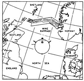 Figure 1-3.-World War I mine and North Sea barrage. later, a small experimental ammunition unit was included in the organization, which was called the Naval Ordnance Laboratory (NOL). For the first time, the functions of material design, reliability, and explosive safety were the responsibility of only one activity. The tasks of the laboratory were to (1) investigate the magnetic and acoustic influences of ships, (2) design a magnetic firing device, and (3) design a 21-inch cylindrical mine that could be laid by submarines with standard torpedo tubes. |