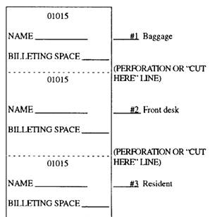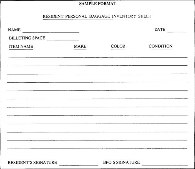 Figure 10-7.-Resident personal baggage inventory sheet. Ownership of the items should be verified by using the resident's claim check and military Identification Card, DD Form 2N. If the resident does not have the claim check, the stub attached to the space status display should be used to verify ownership. An exception to the check-out procedure will be made only during emergencies. The front desk should maintain a key to each baggage room in a sealed, signed envelope kept inside the emergency key locker for this purpose. The NAVPERS 15606 discusses the emergency key control locker under key control procedures in chapter 12. The BPO must maintain a log of items stored in the baggage room. The log should list the tag number, item type, date received, and date(s) resident reopened and inventoried items. It also should list the date the resident removed items from storage. Upon relief, the relieving BPO must conduct an inventory with the current BPO before assuming the responsibility for the baggage storeroom. The information for this inventory may be obtained from the space status display. |