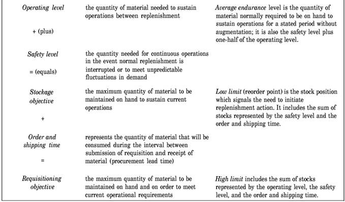 STOCKAGE OBJECTIVES The stockage objective for food items should be the total of the operating level plus the safety level in terms of days of supply . The operating level of supply is the amount of material required to sustain operating requirements between replenishment periods. The safety level of supply is generally the quantity required to be on hand, in addition to the operating level, to permit continued operations if a minor interruption of normal replenishment or unpredictable fluctuations in demand occur. Stockage objectives for ships are issued by the appropriate type commander. Stockage objectives for food items for activities in Alaska, Hawaii, and overseas are issued by the fleet commanders through their logistics agents. Continental United States (CONUS) activities maintaining inventories of food items in end-use accounts, who requisition and stock food items under the appropriation Operation and Maintenance, Navy (O&MN) Subsistence Account, as authorized by the Navy Food Service Systems Office (NAVFSSO), should use the stockage levels recommended in the NAVSUP P-486, volume I. A low limit and a high limit should be established for each item of stock at the beginning of each accounting period. Low limits and high limits should be adjusted as necessary for the following reasons: Increase or decrease in crew size