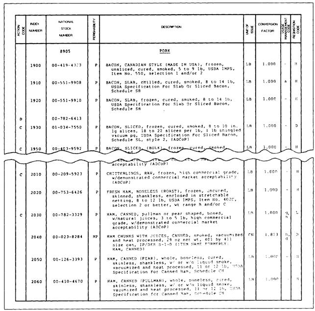 Figure 12-2.-Federal Supply Catalog stock list. Part III, Case Lot Data , is arranged in numerical sequence by national stock number (NSN).It provides weight and dimensional data applicable to unit package for items in part I for which these data are available. Fleet commanders furnish instructions for establishing and maintaining a balanced load through the Atlantic Fleet Requisitioning Guide, CINLANTFLTINST 4210.1, and the Pacific Requisitioning Guide, CINPACFLTINST 4235.1. Afloat requisitioners, bothAtlanticFleet and Pacific Fleet, use the single Consolidated Afloat Requisitioning Guide Overseas (CARGO), NAVSUP P-4998, chapter 3, titled "Subsistence Requisitioning Tables." These tables contain information on stock management of food items and requisitioning procedures. The available seasonal fresh produce listing differs for the Atlantic and the Pacific Fleets. By direction of the Naval Supply Systems Command, the CARGO is issued annually by the Fleet Material Support Office (FMSO). The Subsistence Requisitioning Tables listed in the CARGO show quantities of food items for nine