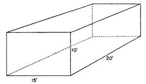 Figure 12-4.-Rectangular space. Unfortunately, all storage spaces are not this easy to figure. Many times there are coils, pipes, lights, and required passageways or aisles that prevent you from using all the space. You cannot pack or store food items up to the overhead or from bulkhead to bulkhead because room for ventilation and access to the food items must be provided. For example, a storage space 22 feet 6 inches long, 14 feet 3 inches wide, and 9 feet 9 inches high is shown in i r 12- There are coils extending out 6 inches