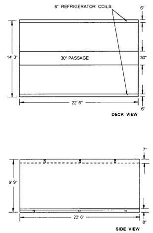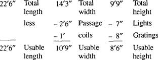 Figure 12-5.-Space with obstructions. from the bulkhead along both the long sides of the space. Also, a 30-inch passageway should be provided down the center of the space. Stud figure 12-5 and notice the allowances that will have to be made for the coils and passageway. In addition, the lights extend down 7 inches from the overhead, and gratings 8 inches high were placed on deck as shown in i r 12- the side view. To find the cubical capacity of this storage space, write down the actual dimensions of the space. Then subtract the dimensions of the allowances you will need to make, like this.