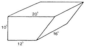 Using the new dimensions, proceed as before. 22 1/2 x 10 3/4 x 8 1/2 = 2,055 15/16 cubic feet. You may have a storage space shaped like the one shown in figure 12-6 First, you will have to get the average width by adding the two widths together and dividing by 2. 12' + 20' =32' = 16 feet. 2 2 Then complete the problem by multiplying this average width by the length and by the height. 16' x 16' x 10'= 2.560 cubic feet. Special Space Problems Some food items, such as frozen meats, should be kept in a special type of storage. The capacity of these spaces limits the amounts you may order. When planning for an extended cruise, you may find that freeze space on your ship is not adequate to store the total meat requirements. You will want to load