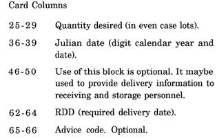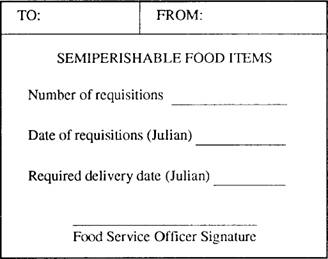Mechanized Method Nonautomated activities receiving semiperishable food items from a mechanized supply activity within the United States are provided prepunched and interpreted decks (computerized cards) of the DOD Single Line Item Request Issue Document (Mechanical), DD Form 1348m, for all semiperishable food items authorized for use in Navy GMs. Automated customer activities do not receive prepunched decks of DD Form 1348m from the supply point. Such activities prepare their own requisitions. Any requisitioner may choose to submit manually prepared requisitions using the DD Single Line Item Requisition System Document (Manual), DD Form 1348. Supply activities with mark-sensing equipment may vary local procedures as necessary for maximum usage of mark-sensing capability. However, the requisition cards should be of a type and format universally acceptable to all mechanized activities. DECK ARRANGEMENT.- The cards in the requisition decks are arranged in the order in which the items appear on the Food-Item Report/Master Food Code List, NAVSUP Form 1059. The three-digit code number in the last three columns of the serial number field (card columns 41-43) provides a simple alphanumerical order of arrangement. PHYSICAL CONDITION AND UPDATING.The requisition cards should be maintained in perfect physical condition. Frayed, torn, or bent cards will cause delay in processing and may delay delivery of material. You should request a replacement for any card that is distorted. New cards received from a supply activity should be filed promptly in the requisition decks, and cards are removed immediately upon request of the supply activity. ROUGH REQUISITIONS.- A rough requisition will be prepared on a Food-Item Report/Master Food Code List, NAVSUP Form 1059, by inserting the following information: The Julian date in the upper right corner The quantity desired under Quantity (even case quantities are requisitioned except items such as condiments that the support activity authorizes for issue in broken case lots) This rough requisition is used to prepare smooth requisitions on the prepunched DD Form 1348m and serves as a retained record of requisitions submitted. The rough requisition is filed in the outstanding requisition file. It maybe used when material is received to identify and check receipts. SMOOTH REQUISITIONS.- To prepare smooth requisitions, the requisitioner pulls one prepunched DD Form 1348m from the requisition deck for each item required and inks in (do not punch) the following data on each card-the quantity desired is transcribed from the rough requisition.