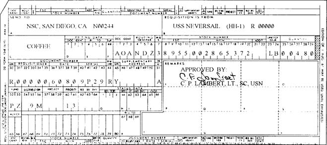 Figure 12-9.-Order for Supplies and Services/Request for Quotations, DD Form 1155, used for an indefinite delivery. purchase order of supplies not received, damaged in transit, or not conforming to specifications of the purchase order. Under extenuating circumstances such notification should be made not later than 30 days after the specified date of delivery. The paying activity may require periodic reports of receipts and performance of deliveries under fast pay. Dealers' Invoices When the dealers' invoices have not been received by your ship or station, your FSO should begin an inquiry 10 days (ship) or 30 days (shore) after receipt of the material, if the purchase authority shows that the dealers' invoices are to be submitted to your ship or station. A dealer's invoice should not be received when fast pay procedures are used or when receipt inspections are accomplished by another activity. Before your ship leaves a foreign port, your FSO should prepare and submit for payment all public vouchers covering the dealers' invoices for food items from foreign vendors. If payment of dealers' invoices cannot be made before the ship leaves port, all such invoices, properly certified, are forwarded to the nearest disbursing officer for payment. However, if there is no supply officer with the disbursing facilities in the immediate vicinity, arrangements should be made with the local naval attache, naval observer, or consular officer to whom the supply officer forwards the public vouchers with certified invoices and three copies of the purchase order so payment can be accomplished. Dealers' invoices offering discounts upon payment within the discount period are processed immediately after the material is received and forwarded to the NRFC or FAADC designated in the purchase document for preparation and payment of public vouchers. When the dealer's invoices are not forwarded within the discount period because of a fault of the dealer, an explanation may be made on a copy of the dealer's invoice or the inspection report, whichever is used for certification of receipt of the material. Dealers' invoices not subject to discount are forwarded to the appropriate NRFC or FAADC within 10 days from the date of receipt of the material or the dealer's invoice, whichever is later. Payment of invoices received from a dealer not located in an area served by the NRFC is made by the disbursing officer of the receiving ship or activity. If a disbursing officer is not available, payment can be made by one of the following offices or centers, whichever or whoever is the nearest: *Military disbursing officer United States disbursing officer (usually assigned to a United States Embassy) Nearest NRFC or FAADC Canadian dealers' invoices are forwarded to the Navy Regional Finance Center, Washington, DC, for payment when a disbursing officer is not available or when no other provisions have been made. Payment is made in Canadian dollars. In summary, dealers' invoices INCONUS for both afloat and ashore activities are submitted to the nearest NRFC or FAADC. OUTCONUS afloat activities dealers' invoices are paid by the ship's disbursing officer. On ships without a disbursing officer, the dealers' invoices are forwarded to the nearest disbursing officer or designated disbursing office. Transfers From Ship's Stores Only individual-sized serving items; that is, food items packaged in small containers providing one individual serving and authorized for special meals, may be transferred from ship's stores to the GM for use in preparing special meals. Underway Replenishment Underway replenishment is a major task. However, this task may be simplified somewhat by careful planning and supervision on your part. The Underway Replenishment Bill is a part of your ship's Standard Organization and Regulations Manual. Compare this bill with others that you have used. If the bill can be improved, discuss your recommended changes with your immediate supervisor. If your ship is attached to an operating force, it will receive most of its support from mobile logistics support groups (AFs). Listed next are some major points that you should consider when planning underway replenishment: 1. Submit your requisition to the AF within the item limits listed in replenishment guides. This gives the AF ample time to process the requisition. 2. Be sure you are ready for replenishment when the time comes by accomplishing the following: a. Know the replenishment stations. b. Determine the number of cases that will come aboard, how many people will be required as checkers, and how many people will be needed in the working party. c. Be sure all storerooms are ready to receive the stores. This may require stock rotation and storeroom cleanup by the bulk storeroom personnel. d. Plan the traffic routes for the working party to take. (Be sure to indicate a separate return from the storerooms to avoid congestion and confusion.) e. The commanding officer (CO) and executive officer (XO) should be informed of the plans for replenishment. 3. Make sure the working party and the checkers are on station before replenishment begins. 4. Be sure the checkers have a system for checking all actual quantities of food items that come aboard. 5. Be sure the working party stays on the job until all food items are received aboard and stored below in the proper storerooms. 6. Be sure the checkers know where all the items are to be sent for storage. The checkers usually should be MSs. 7. Take necessary precautions to see that items, such as fresh fruits, are not pilfered during the storing operation. Procurement for Private Messes Any food items listed in the FSC, as authorized for GM use, maybe requisitioned and held for ultimate sale to private messes. Items listed with restricted usage in the FSC, but not authorized for GM use, are procured only for immediate sale to private messes. Food items not listed in the FSC may be procured for immediate sale by the supply officer, through no