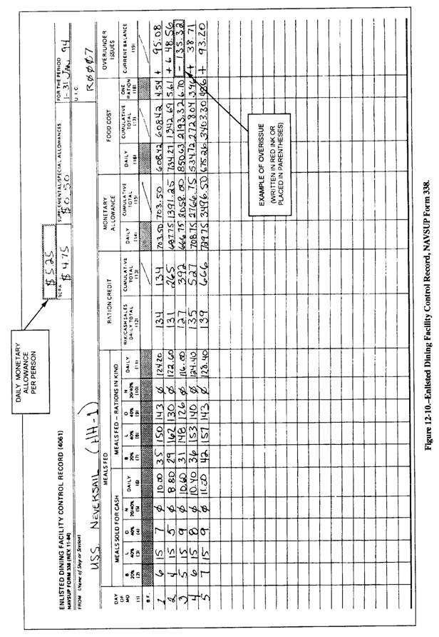 FOODSERVICE COST CONTROL GMs provide high-quality meals to authorized personnel. The FSO maintains financial accountability and control of the GM within the allowed monetary budget. Providing high-quality meals within a prescribed monetary allowance requires managerial skills and constant attention from the FSO and the foodservice division. As a junior MS, you learned the basics of a very challenging rating. As you advanced, your responsibility significantly increased and you now direct more and more of your attention to management. This incidentally is your rating's middle name. The key to effective management is control. As an MS third or second class petty officer, you learned the importance of portion control; also how it related to effective management on a smaller scale. We will now discuss the control procedures used to manage an effective operation and how to use the available resources and money to the Navy's best advantage. Navy GMs afloat and ashore operate on a monetary ration allowance. The allowances represent these dollars and cents called monetary rates. In 1933, the present Navy Ration Law, 10 U.S. Code 6082, came into effect. This law (specified in actual quantity of food) is a converted cash equivalency. You can compute this allowance by using the quantitative food allowance prescribed by the DOD Food Cost Index. This is based on food items authorized by the 1933 Navy Ration Law. The 1933 Navy Ration Law is listed by weight (such as 44 ounces of fresh vegetables) and converted to a monetary allowance. As a senior MS, you should understand not only what a ration is but also the various types of rations used in the Navy. Additionally, you should know which personnel are entitled to rations-in-kind, what forms to use in determining ration credit, and how to determine ration credit afloat and ashore. The NAVSUP P-486, volume 1, defines this in detail. One purpose of a cost control system in a mess is to provide you information on the financial operation of the mess. Cost controls provide the proper detailed information to give you the tools to overcome waste, lack of portion control, unwise menu planning, and/or pilferage; thus, ensuring guidance or restraint over money, material, and personnel. COMPONENTS OF FOOD COST CONTROL The following are five elements of cost control: 1. A prescribed operating limit or budget 2. A knowledge by management of the actions and procedures necessary to maintain within the prescribed operating limits of the mess 3. Prompt and accurate information on the daily progress toward maintaining within operating limits 4. The ability of management to rate the information received 5. The ability of management to follow up and take remedial action as necessary The financial requirements of each activity are subject to circumstances unique to the individual installation concerned. COMPUTING DAILY FOOD COST All GMs post total ration credits daily to the NAVSUP Form 338 whether ashore, afloat in port, or afloat at sea. The NAVSUP Form 338 is shown in figure -