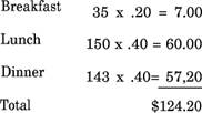 Ashore activities obtain ration credit information on meals sold and meals fed-rations-in-kind from the Subtotal line of the Recapitulation of Meal Record, NAVSUP Form 1292. Afloat activities enter the actual number of meals sold whether in port or at sea. These figures are obtained either from the Cash Meal Payment Book DD Form 1544, or the Sale of General Mess Meals, NAVSUP Form 1046. Meals fed rations-in-kind while at sea will be the same as the number of rations allowed daily. The actual head count numbers for each applicable meal will be used to reflect the number of meals fed rations-in-kind. The following information describes the procedures all GMs must use to complete columns (2) through (19) on the NAVSUP Form 338 ~: Columns (2) through (5). Enter the actual number of meals sold in the applicable column. Other meals, such as brunches, will be shown in the column applicable to directions that are provided in the most current NAVSUPINST 4061.9. Column(6). Multiply columns (2) through (5) by the applicable ration credit conversion factors for each meal. This conversion factor is shown at the top of each column. Carry the resulting figure out to two decimal places, then add the results and enter the total in column (6); for example: