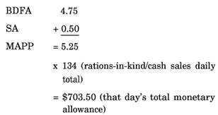 Column (12). Add the figure in column (6) to the figure in column (11). Then enter the results, rounded to the nearest whole number, in column (12). For example, 10.00 + 124.20= 134.20 is rounded off to 134. 0 Column (13). Add the figure in column (12) to the preceding day's entry in column (13). Then post the result in the current day's Cumulative Total column (13). Column (14). The monetary allowance per person (MAPP) is the amount of the basic daily food allowance (BDFA) and any supplemental or special allowance (SA). Multiply the number of rations in column (12) by the monetary allowance per person. Then post the result in column (14) as that day's total monetary allowance; for example: