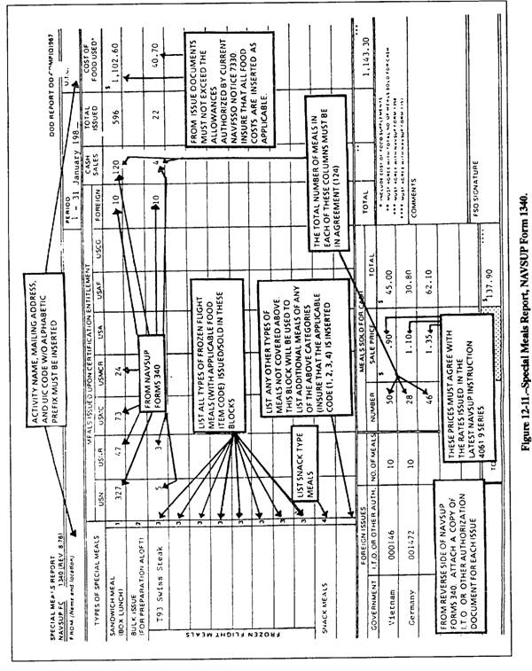ACCOUNTING PROCEDURES When 10 or less special meals are issued during the monthly accounting period, they are accounted for the same as regular GM meals. The accounting procedures discussed next are used only when more than 10 special meals are issued during the monthly accounting period. The FSO uses either a NAVSUP Form 1282 or a NAVSUP Form 1059 to record the quantity and value of food items required in preparing the special meals. The issue document is priced and extended using fixed prices. This is done at the time of issue. The quantity issued is posted as an expenditure in the Other column of the Subsistence Ledger, NAVSUP Form 335. The issue document should be retained by the FSO pending preparation of the Monthly Special Meals Report, NAVSUP Form 1340. General When a flight or operation is canceled or other valid circumstances prevent the use of special meals requested and prepared, they can be returned to the FSO. However, special meals are not returned for credit if more than 3 hours have elapsed since they were issued. Return of cash for unused special meals, already paid for in cash, is authorized. Refunds are made by the FSO or his or her representative only upon receipt of a NAVSUP Form 340 prepared by the officer signing the original request for meals. The request should have a notation "Returned for credit" clearly marked on the original. This is used by the FSO to post credit entries to cash accounts. Components of unused returned special meals should be reused when possible. They need not be taken upon stock and financial records. Monthly Special Meals Report, NAVSUP Form 1340 A NAVSUP Form 1340 i . 12-11 , prepared in duplicate, is used to report the number of special meals issued during the month and the cost of food items used in preparing the special meals. This should be the value of all documents prepared for issue of food items used in the preparation of special meals during the month. This value is entered in the Cost of Food Used column. The cost of supplemental food items may be prorated among the meals in which they are served. The NAVSUP Form 1340 should be completed showing the total meals issued upon certification of entitlement to each government agency and to any foreign enlisted personnel at government expense. This information is taken from the NAVSUP Forms 340, processed during the period covered by the NAVSUP Form 1340. The foreign government and invitational travel order numbers of foreign enlisted personnel under the Military Assistance Program should be shown for foreign issues and should be taken from the Receipt for Flight Meals on the reverse side of NAVSUP Forms 340 for the period being reported. The type of aircraft or small craft and its serial or hull number should be shown in the Comment block when applicable. The FSO should sign the NAVSUP Form 1340, certifying that the special meals indicated were issued. The total value of food items used in preparation of special meals during each accounting period should be entered on the Balance Sheet section of the General Mess Operating Statement, NAVSUP Form 1358, opposite the caption Special Meals under Expenditures. The original NAVSUP Form 1340 is submitted monthly to NAVFSSO with the Ration and Sales Report, NAVSUP Form 1357. A copy is retained for posting the Record of Receipts and Expenditures, NAVSUP Form 367, and in preparation of the quarterly NAVSUP Form 1358. If a completed NAVSUP Form 1340 reveals that the cost of food used for any type of special meal exceeds the monetary allowances for that meal, a letter of explanation should accompany the report explaining why the allowances were exceeded and actions taken to prevent reoccurrence. Cash received for the sale of special meals should be safeguarded and deposited with the disbursing officer. A receipt should be obtained in a Cash Receipt Book NAVSUP Form 470. In addition to the recapitulation on NAVSUP Form 1340, cash collected, deposited, and due from credit sales is reported on the monthly Ration and Sales Report, NAVSUP Form 1357.