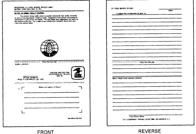 Figure 13-4.-Suggestion to the Food Service Officer, NAVSUP Form 1343. FSO should review all suggestions for possible adoption. EVALUATING FOODSERVICE SUGGESTIONS.- Customers submitting suggestions or comments should be treated as individuals with individual needs. Most customers experience an empty stomach three times a day. Conversely, this need is routinely filled on a more impersonal basis-the same filling for all customers. You may provide the correct service, but if you treat the customer as just one of a group, rather than as an individual, it may cause resentment. Therefore, when evaluating suggestions or comments, you should present the right attitude toward the needs of the customer. These needs may run the extent from the ridiculous, through the routine, to the very difficult. However, these categories reflect your opinion of the needs and requests-not the customer's. The problems are important to the customers, otherwise they would not have submitted a suggestion or comment. Thus, you should make all customers feel that their problem is important. Regardless of the nature or seriousness of a customer's problem, certain negative factors may serve to complicate it. For example, the customer may be angry, worried, or frustrated. Possibly, the customer may be unwilling to accept anything less than his or her desired solution to the problem. Awareness of these factors allows you to approach each suggestion practically and, in turn, deal with most rational suggestions effectively. GIVING FEEDBACK ON SUGGESTIONS.- The FSO should evaluate all suggestions or comments and furnish a reply when requested, within 48 hours. The leading MS should make sure the proper action is taken to adopt or implement those suggestions the FSO considers favorable to improving the quality of service. Adopted suggestions should be posted twice weekly or placed in the ship or station plan of the day for the crew's convenience. Recording Meals Consumed There are different categories under which personnel fall when recording meal consumption. For you to account properly for all meals consumed in a GM, you must understand rations and ration entitlement. Also, the distinction between afloat and ashore recording procedures must be understood. RATIONS.- Many times you have heard senior MSs say, "prepare 100 rations of that item." What the MS really meant is "prepare 100 portions" because a ration is defined as a basic daily food allowance (BDFA). This and related terms will be explained next. Basic daily food allowance. The BDFA is a prescribed quantity of food, defined by components or monetary value, required to provide a nutritionally adequate diet for one person for 1 day. Supplemental food allowance. A supplemental food allowance is a prescribed quantity of food, defined by quantity or monetary value, which, due to unusual or extraordinary circumstances, is required in addition to the BDFA. Special food allowance. A special food allowance is a prescribed quantity of food, defined by components, quantity, or monetary value, required when use of the BDFA is insufficient. Night meals. Night meals are quantities of food that may be furnished to enlisted people standing night watches or performing other assigned duties between 2000 and 0800 hours. The value of food items used in preparing night meals is included in the total cost of issues to the GM. No additional ration credit may be claimed during sea periods regardless of the number of meals an individual consumes, including night meals. Migrations (midrats). Midrats are food items such as soup, crackers, sandwiches, and leftovers normally offered to personnel assuming the midwatch and those being relieved. Midrats are different from night meals in that they are offered to personnel who have already consumed their breakfast, lunch, and dinner during normal meal hours, Therefore, they are not entitled to a fill night's meal. The value of food items used to prepare midrats is included in the total cost of issues to the GM. However, taking ration credit for midrats and/or the sale of midrats is not authorized. Combat meals. Combat meals are classified into special- and general-use categories. Special-use combat meals consist of individually packaged rations, long-range patrol (LRP) rations, and MRE rations. General-use combat meals are regular GM meals prepared from on-hand stocks of perishable and semiperishable subsistence. Picnics, recreation events, and coffee messes, Personnel may be authorized by the CO to receive food items for picnics, recreation events, and coffee messes from the GM. COs should establish such controls as necessary to make sure only personnel entitled to rations-in-kind are furnished food without charge, cooked or uncooked, for picnics or coffee messes. Rations-in-kind. This is the term used to describe meals furnished to enlisted personal from the GM at government expense. RATION ENTITLEMENT.- Regular and Reserve enlisted personnel of the armed services, officer candidates, cadets of the armed forces academies in a duty status, and prisoners of war are entitled to rations-in-kind at government expense under various appropriation acts. Retired enlisted military personnel confined in a hospital or dispensary are entitled to rations-in-kind. Destitute survivors of disasters, refugees, civilian evacuees, and American seamen may be fed without charge in Navy messes. Entitlement is determined and action taken to effect reimbursement by NAVFSSO as appropriate from the data furnished in the certification required for this category of personnel. Rations are furnished to foreign government personnel on a cash basis, except when the invitational travel orders authorize other means of reimbursement. Enlisted personnel in a travel status who are receiving per diem instead of subsistence are not entitled to rations-in-kind unless their orders are endorsed showing the number and type of meals authorized. Cash sales may be authorized to various types of