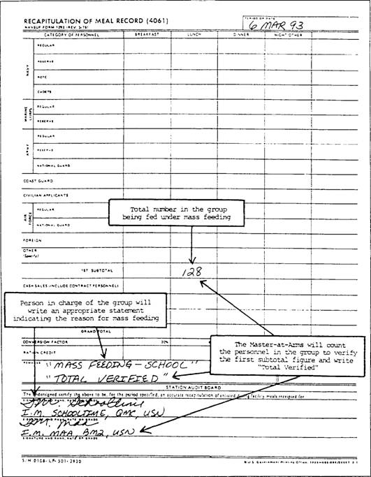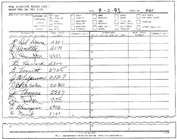 Figure 13-5.-Meal Signature Record, NAVSUP Form 1291. The FSO is responsible for conducting and monitoring the signature head count procedure. The FSO also must train personnel involved in controlling the signature head count procedure, placing special emphasis on the eligibility of patrons authorized to receive rations-in-kind at government expense. The messdeck master-at-arms (MDMAA) is responsible for the following: Determining the eligibility of personnel passing through the serving line to cat in the GM Obtaining signatures and a legible meal-pass number on the NAVSUP Form 1291 Preparing a daily Recapitulation of Meal Record, NAVSUP Form 1292 i . In discharging these responsibilities, the MDMAA places special emphasis on the eligibility of patrons authorized to receive rations-in-kind at government expense. The MDMAA performs the following: Requires each person to exhibit a valid meal pass and identification card Permits new arrivals on travel orders and receiving per diem to have the travel orders endorsed Receives the NAVSUP Forms 1292 for mass feeding in the GM and makes a manual count of the group as they enter the serving line to verify the total Enters Total Verified and signs on the second signature line of each NAVSUP Form 1292 for mass feeding within the mess area The records keeper is responsible for verifying the entries made on the daily NAVSUP Form 1292 by the MDMAA and the cashier and for entry of meals served to personnel not passing through the serving line. The records keeper performs the following: Verifies totals of each type of personnel listed Checks cash sale to make sure credit sales are included in the count