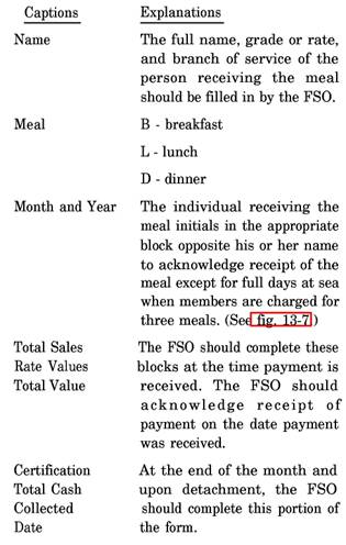 Figure 13-7.-Explanation of the Sale of General Mess Meals, NAVSUP Form 1046. which the meals were sold. Individuals concerned should make payment before detachment. The FSO furnishes a receipt for the cash paid. The Cash Receipt Certificate, NAVCOMPT Form 2114, maybe used as a receipt form. This is done by marking out the line "for which I hold myself accountable to the Treasurer of the United States of America." Deposit of Funds.- When practical, finds in excess of the change fund should be deposited daily with the disbursing officer. When impractical to make daily deposits, the cash should be deposited at least twice weekly. Any exceptions to this must be authorized by the Naval Supply Systems Command. When it is impractical for the collection agent to deposit cash daily, it should be retained in the collection agent's personal custody or turned in to the FSO. Accountability File The FSO must maintain files of accounting records and substantiating documents required for audit of subsistence, supply, and GM operations. Records and documents must be retained and disposed of according to Navy and Marine Corps Records Disposition Manual, SECNAVINST 5212.5. See also appendix B of the NAVSUP P-486, volume 1. RESPONSIBILITY.- The accountability file must be established by the FSO on the first day of the accounting period. SECURITY.-The accountability file must be kept under lock and key by the accountable officer to maintain security of all accountable transactions and substantiating accountable documents. At the end of the quarter, the documents in this file become the ship's retained returns for the period, except the rough inventory. The rough inventory should be retained in the accountability file until the next rough inventory is made. |